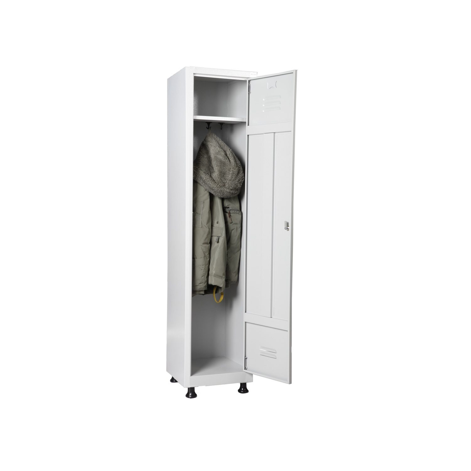 Гардеробът AP1 500 е практичен модел, подходящ за работни, учебни и спортни среди. Конструкцията му от здрава стомана с прахово покритие RAL 7035 осигурява дълготрайна употреба и лесна поддръжка. Включва горен рафт, релса и две закачалки за максимална организация.