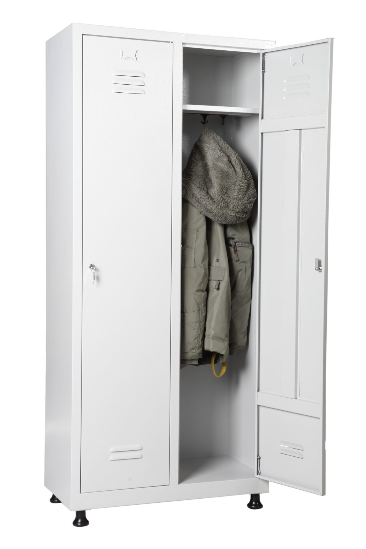 Моделът разполага с две отделни врати, всяка с горен рафт, релса и две закачалки, което гарантира комфорт и организация за двама потребители. Освен това шкафът е оборудван с вентилационни отвори за добра циркулация на въздуха и нивелиращи се пластмасови крака за стабилност дори при неравен под.
