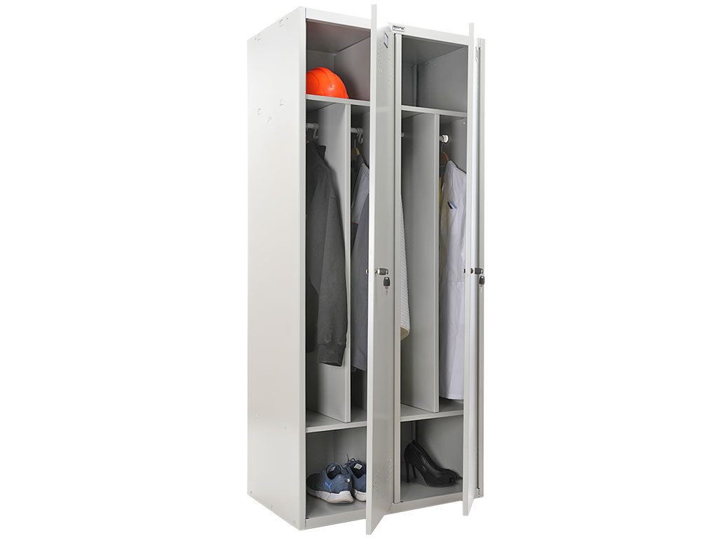 Моделът има две врати с отделни заключвания, две рафтови нива и вертикална преграда с релса и закачалки във всяко отделение. Това осигурява удобно разделяне на дрехи, обувки и аксесоари, подходящо за съблекални, офиси, училища и спортни центрове. Вентилационните отвори осигуряват постоянен въздушен поток, като предотвратяват натрупване на влага и миризми.