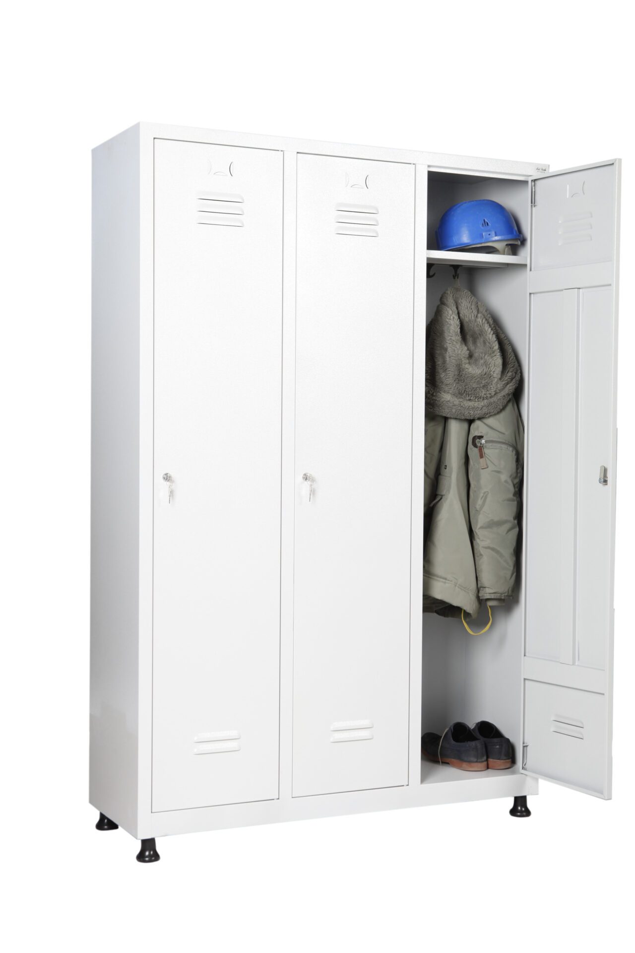 Металният гардероб AP3 1200 400 H1850 е проектиран за функционалност и дълготрайност в различни среди – съблекални, офиси, производствени помещения и спортни зали. С трите си отделения, всяко оборудвано с горен рафт, релса и закачалки, този модел осигурява удобство и лична зона за няколко потребители едновременно.