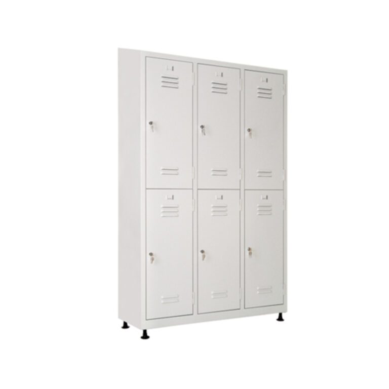 Шкафът е изработен от висококачествена стомана с дебелина 0.7 мм и е покрит с устойчиво прахово полимерно покритие в сив цвят RAL 7035. Всяко от шестте отделения разполага с релса и две закачалки, а индивидуалните ключалки осигуряват сигурност и личен достъп. Благодарение на вентилационните отвори и нивелируемите крака, шкафът остава стабилен и добре проветрен при продължителна употреба.