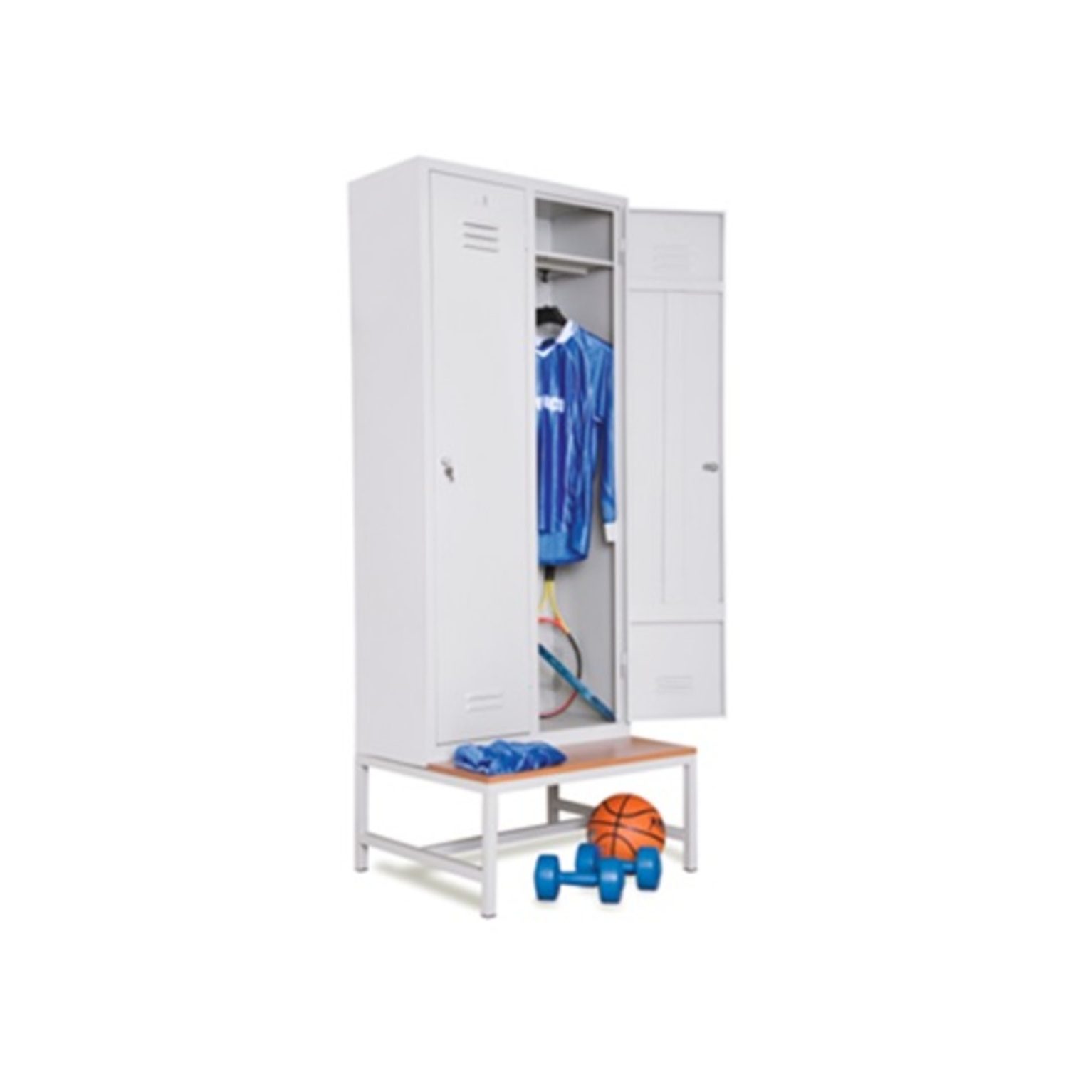 Металният гардероб с 2 врати и пейка е проектиран да съчетава удобно съхранение и комфорт при използване. Той е изработен от здрава стомана с прахово боядисано покритие, което гарантира дълъг живот и лесна поддръжка. Вградената пейка улеснява събличането и обличането, което го прави идеален за спортни съоръжения, съблекални и работни помещения.