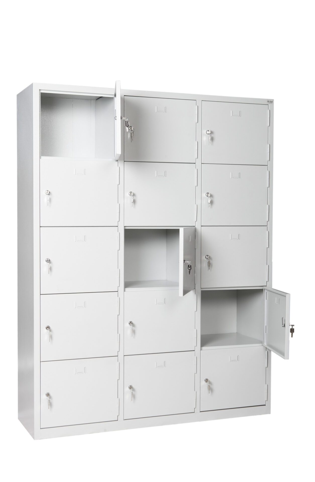 Шкафът за лични вещи с 15 врати на 4 нива е практично решение за съблекални, офиси и обществени сгради, където е необходимо сигурно съхранение за повече хора. Изработен е от метал с прахово покритие, което осигурява дълготрайна издръжливост и лесна поддръжка. Благодарение на множеството отделения, моделът позволява ефективна организация.